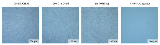 Pennsylvania State University (Penn State) received two CsPbBr3 samples: one was cut from the boule crosswise (perpendicular to the growth direction) and one cut from the boule longitudinally (parallel to the growth direction). Surface preparation methods need to be developed in order to obtain ultra-smooth, nm-level surface roughness as it enables reduced surface defect concentration, improved charge transport between the semiconductor and electrode, and overall increased sample reproducibility. Recent literature reports suggest that chemical–mechanical polishing (CMP) approaches may be viable for the CsPbBr3 crystal system [19]. This approach was adapted at Penn State and implemented on the CsPbBr3 crystals received from Fisk. CsPbBr3 crystals were first polished using 800 and 1200 grit SiC paper, followed by a 1 µm polishing suspension on a neoprene polishing pad. Chemical–mechanical polishing was then performed to eliminate further scratching. Crystals were mechanically abraded using the neoprene polishing pad and a chemical etchant lubricant comprised of isopropyl alcohol and dimethylsulfoxide (DMSO) suspension (50/50 vol%). Figure 5 shows optical micrographs of the CsPbBr3 crystal surface after each step of the polishing process. The CMP process clearly eliminates all major scratches from the surface, leaving behind only some residual minor scratch marks. Critically, this process also only takes 30 s and can be applied more uniformly across sample sets.