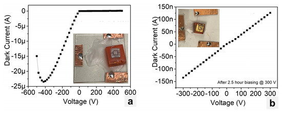 Figure 9a,b show the I–V characteristics for the CsPbBr3 and CsPb(Br,I)3 planar devices, both fabricated at Northwestern (Figure 4c,e). The In–CsPbBr3–Pt exhibited a rectifying behavior with a breakdown voltage around −400 V, while the Pb–CsPb(Br,I)3–Au device exhibited a resistive behavior. Similar to the devices fabricated at RMD, the CsPbBr3 device fabricated at Northwestern was very noisy; however, the leakage or dark current remained low.