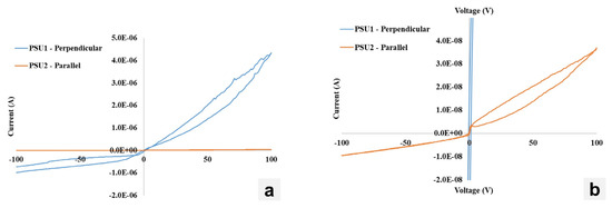 Figure 10 shows the I–V characteristics of the fabricated CsPbBr3 devices with crystals cut perpendicular and parallel to the growth direction. The perpendicular sample clearly shows an I–V characteristic matching that of a rectifying junction, with a current significantly higher under forward bias than under reverse bias. The magnitude of the measured current is quite high, with µA level currents measured at −100 V. This is two orders of magnitude higher than what is typically expected from CsPbBr3. There also appears to be substantial ionic mobility measured, as seen by the opening of the hysteresis in both the forward and reverse bias. Conversely, the CsPbBr3 crystal cut parallel to the growth direction features I–V characteristics that are much more promising. Similar to previous investigations, 10 nA dark currents are measured at −100 V. A rectifying junction appears to have formed, with a forward bias ~4× higher than the reverse bias, though this I–V characteristic does not have a clear knee voltage to measure a Schottky barrier height, rather a sharp increase in the measured current at ~0 V. This may be due to the presence of the SiO2 layer which may build up charge and discharge over the course of the measurement. Forward bias appears to have some degree of ionic mobility with the presence of a hysteresis loop; however, reverse bias conditions eliminate this with no hysteresis observed. This may be due to which ions are mobile in this crystal system, with negatively charged ions (Br−) being more mobile and able to drift under positive bias or may be associated with the electrode/passivation structure being more effective at blocking the collection of ionic-induced current measurements. Through comparing the I–V characteristics of these crystal structures, it is clear that cutting the CsPbBr3 parallel to the growth direction is advantageous for lowering measured dark currents.