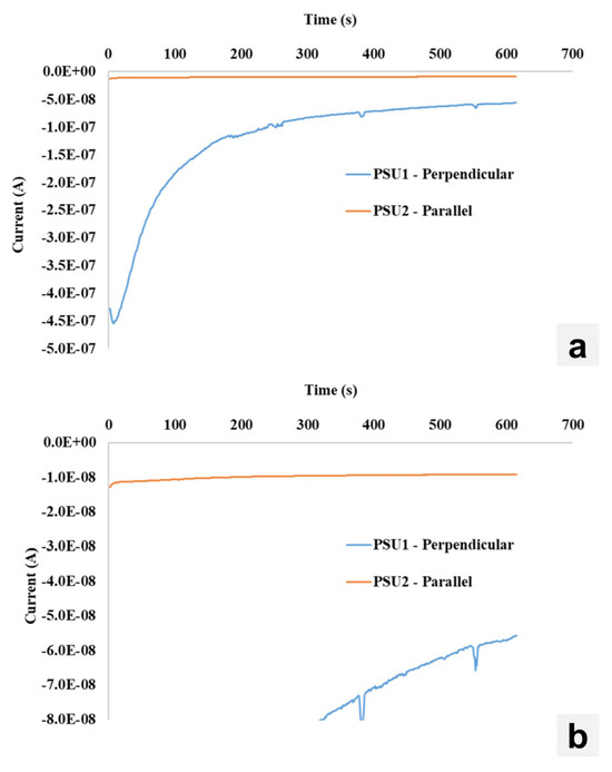 (a) Current–time characteristics measured at a constant −100 V bias for CsPbBr3 samples cut perpendicular and parallel to the growth direction. (b) Zoomed-in view to resolve the parallel direction.