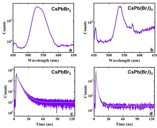 (a) Photoluminescence spectrum of CsPbBr3. (b) Photoluminescence spectrum of CsPb(Br,I)3. (c) PL lifetime of CsPbBr3. (d) PL decay curve of CsPb(Br,I)3.