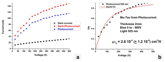 Figure 14a shows the graph of current as a function of applied reverse bias from 0 to −500 V with and without the 525 nm illumination (Figure 12c). The photocurrent curve was obtained by subtracting the dark current (measured without illumination) from the current measured with illumination. The light-generated charge carriers’ contribution was determined by fitting the photocurrent curve using the Hecht equation defined as the following: