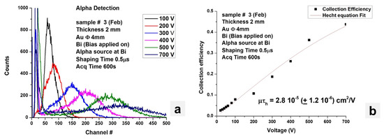 Another commonly used method to determine the μτ product is to irradiate the device with alpha particles and determine the peak centroid as the function of the bias voltage. Figure 15a shows the 241Am alpha spectra as a function of bias and measured by the CsPbBr3 device shown in Figure 7a. Figure 15b shows the graph of the peak centroid as the function of the bias voltage. Fitting the data with the Hecht equation, μτ of 2.8 × 10−5 cm2/V was estimated.