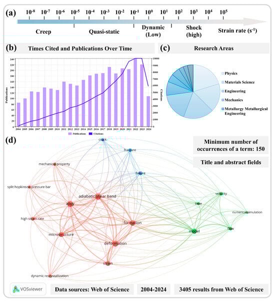 (a) Classification of mechanical testing based on the strain rate [7]. (b) The number of articles published annually on the topic of adiabatic shear instability over the past 20 years and the corresponding citation counts. (c) Research areas of articles published in the last 20 years. (d) Analysis of the relevance of literature on adiabatic shear instability retrieval results (data sourced from the Web of Science database). Reproduced with permission from Elsevier and open-access websites.