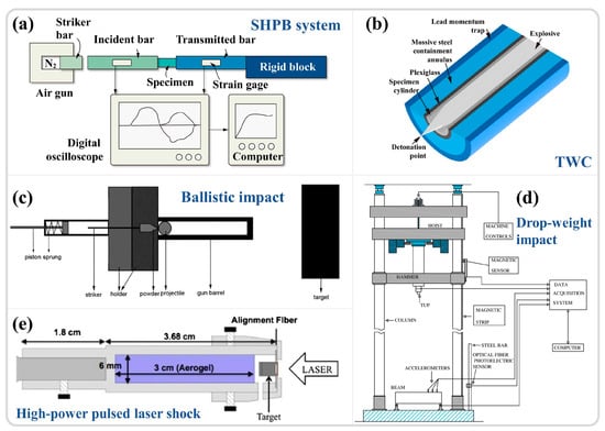 Schematic diagram of commonly used high-speed impact test techniques: (a) SHPB [26]; (b) TWC; (c) Ballistic impact [56]; (d) Drop-weight impact [65]; (e) High energy laser shock [71]. Reproduced with permission from Elsevier, Wiley, and open-access websites.