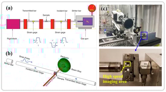 (a) Schematic illustration of the SHPB [74]. (b) Schematic diagram of the synchrotron X-ray radiation integration with SHPB [10]. (c) Integration of SHPB with infrared thermometry and high-speed imaging techniques, and further magnification of the high-speed imaging area. [76]. Reproduced with permission from Elsevier, Wiley, and Springer Nature.