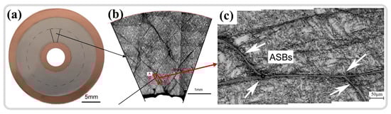 (a) An unetched cross-section of the cylindrical specimen from the TWC experiment. (b) Metallographic structure of the selected area in (a), which reveals a significant presence of ASBs internally. (c) A higher magnification view of the ASB in (b) [63]. Reproduced with permission from Elsevier.