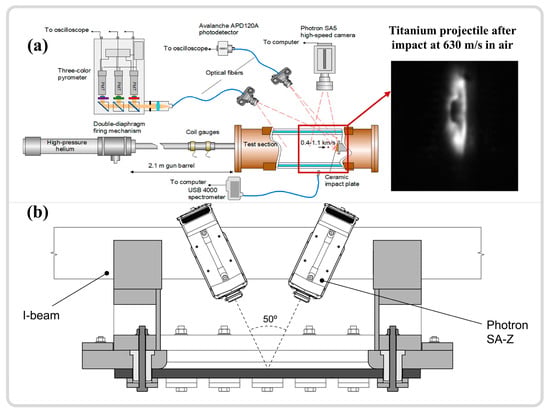 As an important method for studying the dynamic response and failure behavior of materials under high-velocity impact conditions, this approach involves the impact of projectiles, such as spherical projectiles or those combined with handgun ammunition, rifle ammunition, and large-caliber projectiles [78,79], on target materials, as depicted in Figure 3c. This allows for the investigation of material deformation, crack propagation, and failure under high-strain-rate conditions. The strain rate range for ballistic impacts is typically very high, reaching up to 103 to 106 s−1. This method effectively simulates high-speed impact scenarios encountered in real applications [80], such as ballistic missiles and projectile impacts, making experimental results more applicable to actual situations. Moreover, various technologies have been developed in conjunction with ballistic impact experiments, including high-speed cameras (Figure 6a) [81,82], digital image correlation techniques (DIC) (Figure 6b) [83], flash X-ray cameras [84], and high-speed temperature measurement systems [78]. These advanced characterization methods enable researchers to analyze material dynamic strength, crack propagation characteristics, and energy absorption capacity with greater precision. Although ballistic impact experimental methods also have some drawbacks, such as complex operational procedures, high experimental costs, and challenges in data processing, they play an irreplaceable role in assessing the impact resistance and dynamic responses of materials.