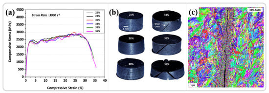 (a,b) The mechanical response and macroscopic morphology of cylindrical specimens under varying strains. (c) The orientation distribution results in the ASB region at a strain of 33% [103]. Reproduced with permission from Elsevier.
