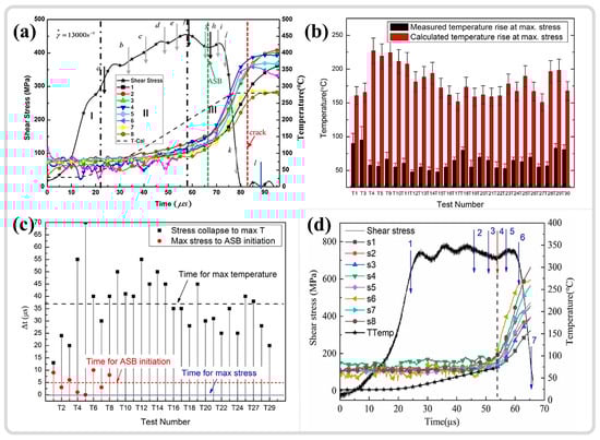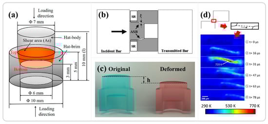 Hat-shaped specimens are commonly used in the study of adiabatic shear instability phenomena. These specimens transform the uniaxial stress state into a combined compression-shear or pure shear stress state through their geometry, confining plastic deformation within a pre-designed stress concentration zone. A minor compression increment achieves a significant shear strain, inducing the onset of ASB in the orange region depicted in Figure 8a. The compression increment of the protrusion of the hat-shaped specimen can be regulated by a stopper ring (as shown in Figure 8b) to control the deformation within the shear region, as illustrated in Figure 8c. Initially designed by Meyer and Hartmann et al. [107,108], the hat-shaped specimen has been extensively applied in the ASB studies of materials such as magnesium alloys [109], aluminum alloys [110], steel [111,112], and titanium alloys [113,114,115,116,117]. Typically, the protrusion of the hat-shaped specimen is slightly larger than the diameter of the specimen base, leading the forced shear region to bear the impact of compression loads in addition to shear stress. Minnaar et al. [118] reduced the protrusion to slightly smaller than the base diameter by modifying the specimen geometry to minimize the impact of compressive stress on testing, and they investigated the adiabatic shear behavior of various steels and titanium alloys. They concluded that the failure and ultimate fracture caused by plastic instability cannot be fully explained from a thermodynamic perspective, requiring additional considerations of microstructural damage mechanisms. Traditional cylindrical hat-shaped specimens also face challenges in in situ analysis, prompting the development of flat hat-shaped specimens. Combined with high-speed temperature measurement, these specimens facilitate the study of the relationship between temperature evolution and dynamic mechanical response in the shear region, as shown in Figure 8d, which is significant for elucidating and explaining the microstructural evolution within ASB [76,119,120,121].