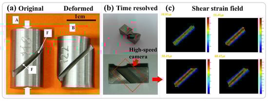 The shear compression specimen (SCS), a commonly used specimen for studying adiabatic shear instability, typically consists of a cylinder or cube with two grooves inclined at 45° relative to the longitudinal axis, as shown in Figure 9a,b for cylindrical and cubic SCS specimens, respectively [25,122]. Under compressive loading, the designated area primarily undergoes shear deformation. Similar to the hat-shaped specimen, the onset of instability in the SCS specimen depends on the material’s intrinsic properties and the specimen’s geometric dimensions. The macroscopic morphology before and after deformation is illustrated in Figure 9a. The grooves in the shear region are exposed, facilitating time-resolved observation and analysis of the shear region, as demonstrated in Figure 9b with high-speed filming of the red-colored groove, and the results, as shown in Figure 9c, depict the variation of the shear strain field with time [25]. Zhang et al. [123] utilized SCS specimens in conjunction with high-speed infrared detectors to investigate the thermomechanical response and instability behavior of two different types of titanium alloys under high strain rates. The findings indicate that, prior to a significant drop in stress and the onset of adiabatic shear instability, the conversion ratio of plastic work to temperature differs from the traditionally assumed values of 0.9 or 1. The temperature rise in the adiabatic shear region is relatively limited and insufficient to trigger thermoplastic instability, which aligned with the research results of Guo et al. [24]. The advantages of the shear compression specimen include the following: (1) The groove design on both sides of the cylinder or cube enables high-speed imaging, thermometry, and other real-time characterization. (2) The geometric dimensions induce stress concentration in the designated area, facilitating the study of adiabatic shear instability phenomena. Its potential disadvantages are that, compared to traditional compression or tension specimens, the design and fabrication of SCS specimens may be more complex and time-consuming.