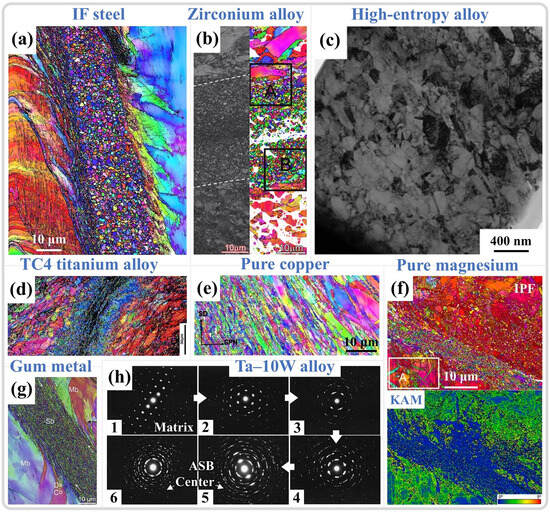 Extreme conditions within the ASB may induce various deformation mechanisms, which are dependent on the material type. As emphasized earlier, substantial grain refinement, a prevalent occurrence in the ASB, is pivotal for the initiation and progression of shear localization and the changes in apparent mechanical behavior. As depicted in Figure 10, the microstructures of adiabatic shear zones in steels [111,112,142], zirconium alloys [143,144], high-entropy alloys [62], titanium alloys [145,146,147], copper alloys [60], magnesium alloys [56,109], and tantalum–tungsten alloys [32,148] are summarized. The most distinctive characteristic is the equiaxed and fine-grained grains in the center of the ASB, with a relatively random orientation and limited strain, as seen in Figure 10f, where the ASB in a magnesium alloy exhibits a small KAM value. Additionally, the adiabatic shear zone can be divided into three parts based on its characteristics: (1) The equiaxed nanocrystalline core of the ASB; (2) The transition zone along the shear direction at the edge of the ASB; (3) The coarser matrix portion [11].