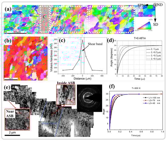 Jiang et al. [117] employed SHPB combined with hat-shaped specimens to study the microstructural evolution of pure titanium ASB, indicating that the microstructure within the ASB consists of ultrafine grains with large-angle boundaries, with the average grain size decreasing from an initial 20 μm to 0.1–1 μm, as shown in Figure 11a,b. Additionally, the Hall-Petch effect and work hardening result in significantly higher hardness in the ASB region compared to the surrounding transition area and matrix, as shown in Figure 11c. With a ratio of 90% between plastic work and thermal conversion, the temperature in the ASB region is estimated to rise to 930 K (approximately 0.48 Tm (melting temperature)), corroborated by RDR kinetics calculations, which demonstrate that DRX can be completed within a loading time of 80 μs, as shown in Figure 11d, with equiaxed ultrafine grains being the product of DRX. Li et al. [145] investigated the microstructure of ultrafine-grained pure titanium ASB and observed that the initial 120 nm grain size structure can still undergo significant refinement in the ASB, with the grain size reaching approximately 40 nm, as shown in Figure 11e. The temperature in the ASB region rises to approximately 900 K (about 0.46 Tm), with the same conversion ratio of 0.9 used for temperature estimation, enabling RDR, as shown in Figure 11f. Such a temperature increase in the ASB is an important consideration for studying microstructural evolution mechanisms [114]. The temperature rise during high-strain-rate deformation could be described by the following equation [152],