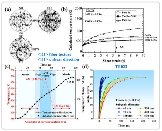 (a) Tantalum ASB center pole figure. (b) Temperature rise with increasing shear strain for pure Ta, Ta-10W, and pure copper calculated using the Johnson–Cook equation [148]. (c) Temperature distribution in the shear region of Ti1023. (d) Time required for RDR completion at 0.38Tm for different subgrain sizes in Ti1023 [7]. Reproduced with permission from Elsevier.