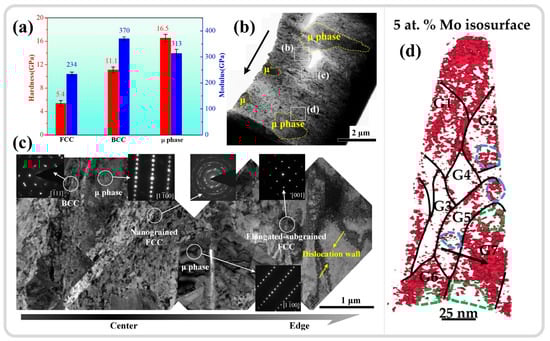 (a) Hardness difference between the matrix phase and precipitated phase within tungsten-based high-entropy alloys. (b) Macroscopic BF image morphology and the distribution of superhard μ phase within the ASB of tungsten-based high-entropy alloys. (c) BF image morphology and SAED results of different phases from the center to the edge of the ASB [30]. (d) APT Mo element 5 at.% isosurface distribution at the center of the ASB in dual-phase titanium alloys [159]. Reproduced with permission from Elsevier.