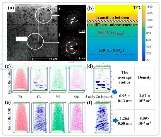 (a) BF image morphology of the adiabatic shear fracture zone and SAED. (b) Predicted maximum temperature during dynamic deformation in the area of (a), with β-transformation temperature and 0.4Tm temperature line indicated [21]. (c,d) Elemental distribution in the matrix and 5 at.% contour distribution of Cu element. (e,f) Elemental distribution in the ASB and 5 at.% contour distribution of Cu element, with statistics on precipitate size and density in the matrix and ASB [111]. Reproduced with permission from Elsevier.
