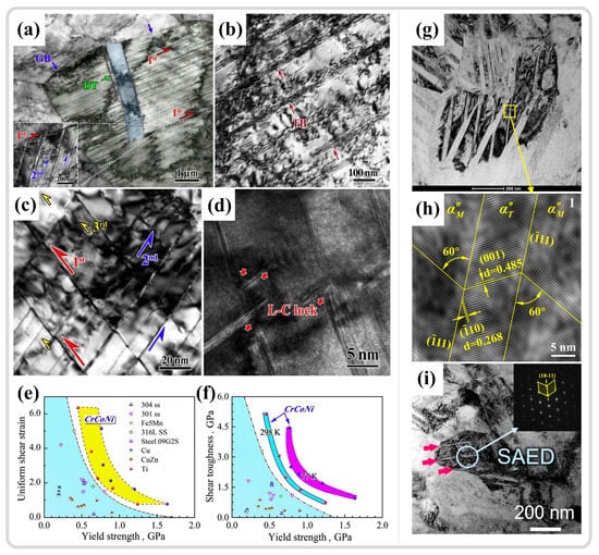 (a) Morphology of the uniform shear deformation zone under dynamic deformation at room temperature in BF imaging. (b) High-density dislocations at the twin boundaries and deformation twins at room temperature. (c) Multi-twinning grid morphology in the uniform shear deformation zone under dynamic deformation at low temperatures. (d) High-resolution transmission electron microscopy (HRTEM) image showing the Lomer–Cottrell lock in the shear deformation zone at low temperatures. (e,f) Comparison of the uniform shear strain and shear toughness of CrCoNi medium-entropy alloys with existing research results [163]. (g) High-density lath-like structure within the nano grains at the center of the ASB in Ti1023. (h) HRTEM image showing α″ martensitic nanotwinning in the rectangular region of (g) [7]. (i) {10–11}α nanotwinning morphology and SAED results at the center of the shear band in Ti1023 [11]. Reproduced with permission from Elsevier.