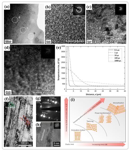 (a) BF imaging morphology of the ASB. (b–d) HRTEM images and the corresponding SAED results of the amorphous region, the transition region from amorphous to crystalline, and the fine scaled nanocrystals region in (a), respectively. (e) Temperature distribution near the adiabatic shear zone as a function of distance in the shear band [167]. (f) BF images of the twins, hcp phase, and amorphous phase near the ASB in the CoMnFeCoNi high-entropy alloy. (g) SAED results indicating the presence of the hcp phase and twins. (h) HRTEM and Fourier transform results of the amorphous region. (i) Graded deformation mechanisms in CrCoNi-based high-entropy alloys—elastic deformation, dislocation migration, twinning, phase transformation, and eventual amorphization—where triggering the next mechanism requires the generation of additional defects [9]. Reproduced with permission from Elsevier and open-access websites.
