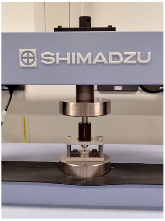Shimadzu universal testing machine with a sample loaded in the test rig—3-point bend test jig.