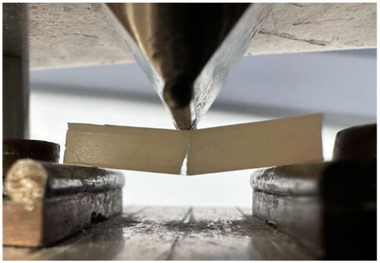 These varying thicknesses of the test material were designed to replicate the depth of a dentine replacement material in typical cavities in posterior teeth. The samples were cured using a 9 overlapping irradiation window technique ISO4049 [40]. An LED curing light 700 mW/cm2 (Model DEMI PLUS Kerr Corporation, Orange, CA, USA) was used for 20 s per window, as per the manufacturer’s recommendations [8,41]. A natural sharp pre-crack, as close to 0.1 mm as possible, was introduced into each sample using a razor blade ISO23146 [42]. To confirm the crack depths of each sample, a 3D microscope (Tucsen Photonics Co., Ltd., Fuzhou, Fujian, China) was used to measure the crack depth (60 samples). Each sample was tested using a 3-point bend test jig (see Figure 2) within the universal testing machine (Shimadzu, Model AGS-X Shimadzu Corp., Kyoto, Japan) at a crosshead speed of 1.0 mm/min until specimen fracture (see Figure 3). The force required to fracture was recorded in Newtons, (N), to provide data to calculate fracture toughness (MPa.m1/2) (see Table 2). Following fracture toughness testing, each sample was assessed under a scanning electronic microscope (SEM) (Ziess Sigma 300VP Field Emission Scanning Electron Microscope [Carl Zeiss Ltd., Cambourne, UK]), to investigate how the fractures propagated following the catastrophic failure of the sample.