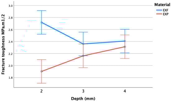 Mean fracture toughness of sFRCs EXF and EXP and depths with 95% CI.