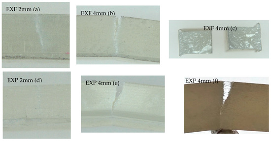 Fractured samples of EXF 2 mm and 4 mm and EXP 2 mm and 4 mm. Image (a) is EXF 2 mm after fracture; image (b) is EXF 4 mm after fracture; image (c) EXF 4 mm after catastrophic fracture; image (d) is EXP 2 mm after fracture; image (e,f) are EXP 4 mm after fracture.
