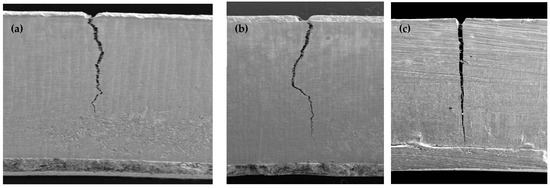 SEM image of crack propagation in (a) EXF 2 mm sample, (b) EXF 2 mm sample and (c) EXP 2 mm sample.