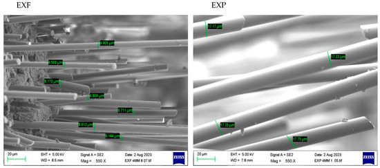 SEM imaging allowed for measurements of fibre diameter for EXF and EXP. Figure 7 shows the difference in fibre diameter and correlates with the figures from the manufacture in Table 1, as well as demonstrating that EXF samples had short and randomly distributed fibres, as shown in Figure 8.