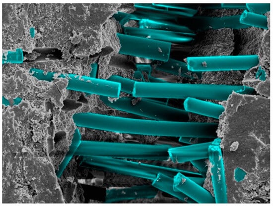 As seen in Figure 6 and Figure 9, SEM analysis provided information on the fibre behaviour following fracture toughness testing and showed that fibres stopped the crack’s path of propagation and created a zig-zag pattern where the fibre interrupted the path of fracture. Fibres demonstrated both a bridging behaviour (see Figure 9a,b) as well as ‘pull out’ (see Figure 9e,f) and indications of potential fibre fracture (see Figure 9c,d).