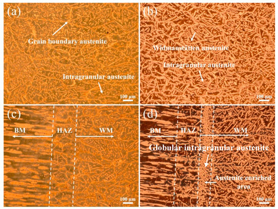 Optical microstructures of weld joints: (a) WM in experiment A, (b) WM in experiment B, (c) HAZ in experiment A, and (d) HAZ in experiment B.