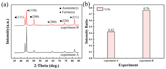 Influence of nitrogen on the XRD patterns of weld joints: (a) XRD patterns, and (b) ratio of the total peak intensity of austenite to ferrite.
