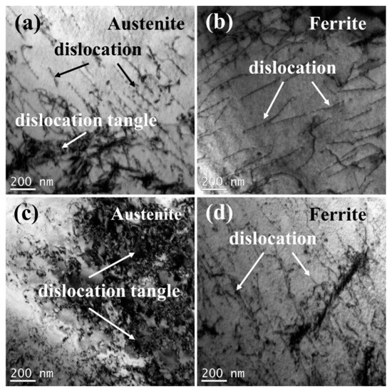 The microhardness of different zones of the weld joints and two phases in the WM in experiments A and B are shown in Figure 7. The HAZs all exhibited the highest microhardness in experiments A and B due to the coarse grains and high content of the ferrite phase, which is generally identified as the strengthening phase in duplex stainless steel [31]. The BM exhibited the lowest microhardness. The addition of nitrogen showed little influence on the microhardness of the interior of the WM. The microhardness of the austenite-enriched area was higher than that of the interior of the WM (Figure 7a). Generally, the microhardness of duplex stainless steel may rise with the increase of the ferrite content [32,33]. In order to further explore the effect of nitrogen on the microhardness of the WM, the microhardness (Figure 7b) and the dislocation characterization (Figure 8) of the ferrite and austenite in the WM were analyzed. Compared with the BM, the microhardness of the two phases in the WM in experiment A increased. The reason for this may be solid solution strengthening [34] caused by nitrogen segregation in austenite (Table 3). An interesting phenomenon was observed: in the welds with nitrogen addition, the hardness of the austenite phase is greater than that of the ferrite phase. In contrast, in the base material and in the welds without nitrogen addition, the hardness of austenite is lower than that of ferrite. The austenite phase is generally identified as the ductile phase in SDSS [35]; thus, compared with the ferrite phase, there may be more dislocation multiplication and dislocation tangle (Figure 8), which can increase the microhardness of the microstructure. The addition of nitrogen significantly increased the amount of dislocation tangle in the austenite. Thus, there may be two factors that increase the microhardness of austenite: (a) solid solution strengthening of nitrogen; and (b) more dislocation multiplication and dislocation tangle. The reduction of the chromium content may decrease the microhardness of ferrite.