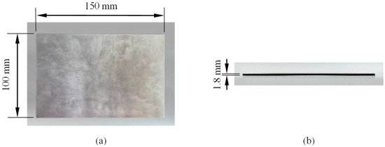 The TI-CF FML analysed in this study is composed of T300 carbon-fibre/epoxy prepreg (0°/90°) manufactured by Dongguan Airbus Composites Technology Co., Ltd. (Dongguan, China), with a fibre mass fraction of 58.0% and a ply thickness of 0.4 mm, interspersed with thin Ti-6Al-4V titanium alloy sheets, each with a thickness of 0.5 mm. The manufacturing process began with mechanical grit sanding surface treatment using 180-grit sandpaper on the Ti-6Al-4V sheets to increase surface roughness and enhance bonding at the metal-composite interface. A straightforward lay-up process was followed according to the lay-up configuration of Ti/(0°/90°)2/Ti. The assembled laminates were then vacuum-bagged and cured in an autoclave at 80 °C for two hours. A vacuum pressure of 0.09 MPa was applied throughout the curing process. The specimen was cut to dimensions of 150 mm × 100 mm, as shown in Figure 1, with a total thickness of 1.8 mm and a weight of 101.4 g.