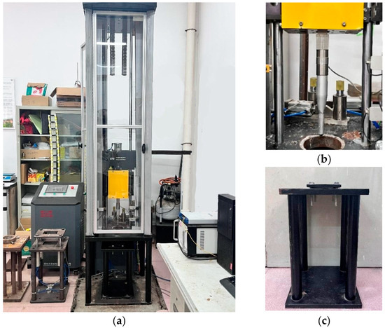 Experimental setup: (a) drop-weight impact testing machine, (b) impactor, (c) support fixture.