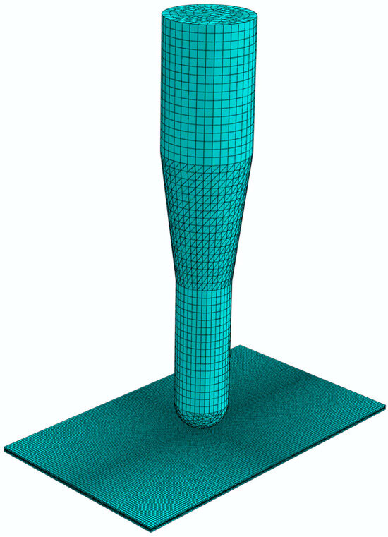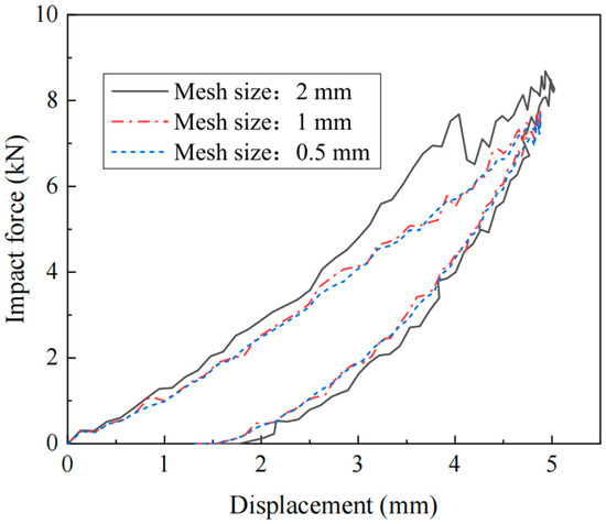 Three mesh sizes were selected for the laminate for sensitivity analysis, specifically 2 mm, 1 mm, and 0.5 mm. Additionally, eight meshes are set along the thickness direction. Figure 4 shows the impact force and displacement curves for different mesh sizes when the impact energy is 16.9 J. It can be observed that the curves for mesh sizes of 1 mm and 0.5 mm largely overlap. Considering computational accuracy and efficiency, a mesh size of 1 mm was chosen for the simulation. During the impact, the deformation and damage of the laminate mainly occur in the central region. Therefore, a finer mesh is used in the central impact area when partitioning the mesh. There are 180 meshes along the long edge of the laminate and 110 meshes along the short edge. The mesh density gradually decreases outward from the impact point, ensuring both the accuracy of the analysis results and improved computational efficiency.