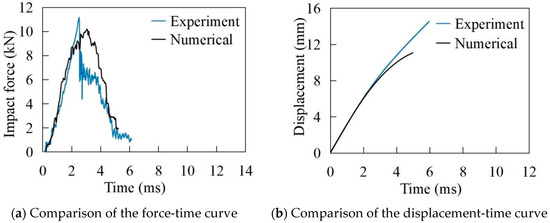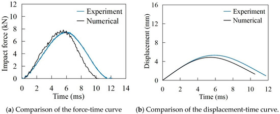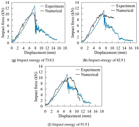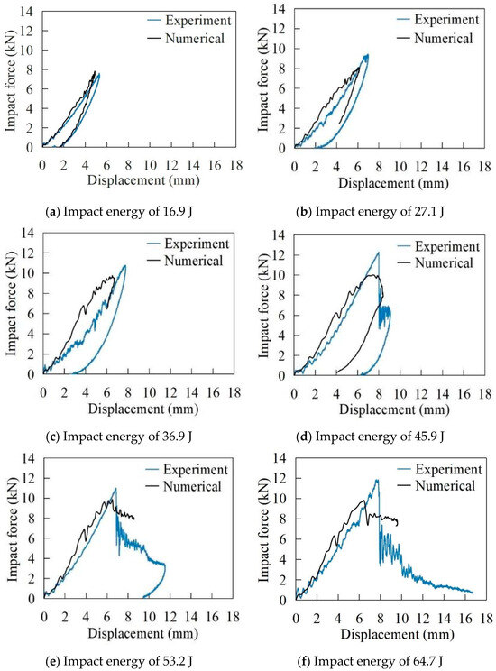 Figure 10 displays the numerical and experimental results of the impact force versus displacement curves of the specimen for impact energies ranging from 16.9 J to 91.9 J. It is evident that the simulated curve aligns well with the experimental curve.