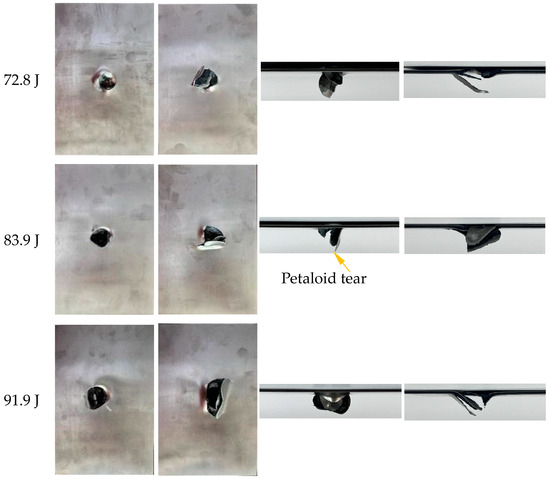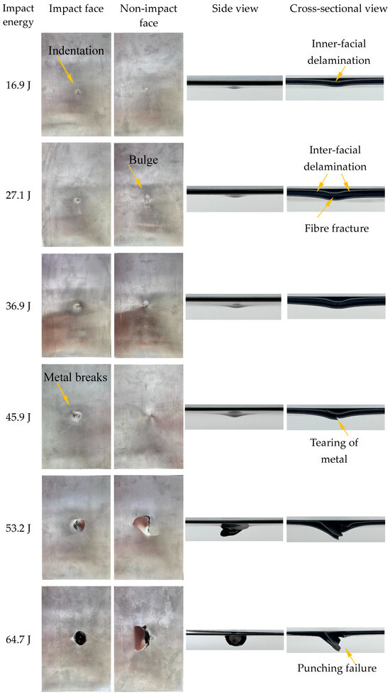 The impact failure mechanisms of the TI-CF FMLs are analysed in this section. The photographs of the specimens after the impact tests are depicted in Figure 8. The specimen failure mechanism can be considered as three distinct modes, which are categorised based on the observed damage behaviour under different impact energy levels.