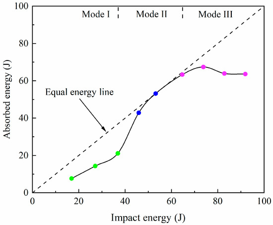 The energy absorption of the laminate, a crucial parameter in evaluating the material’s resistance to damage under impact loads, is determined by the area under the impact load versus displacement curve. The impact energies and the specimen absorbed energies are listed in Table 2 and illustrated in Figure 9. The curve depicting impact energy versus absorbed energy can be divided into three regions corresponding to Mode I, Mode II and Mode III, respectively. The equal energy line, showing complete absorption of the impact energy, is plotted as a dashed line for comparison purposes in Figure 9.