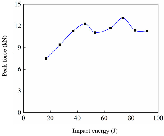 The experimentally measured peak force and impact energy are listed in Table 3 and illustrated in Figure 11. For impact energies ranging from 16.9 J to 36.9 J (Mode I), the peak force rises with increasing impact energy before stabilising. Subsequently, the peak force reaches a plateau, fluctuating between 11.1 kN and 13.1 kN. Notably, at an impact energy of 73.8 J, the force peaks at 13.1 kN, which is more than twice the 5.5 kN measured for the titanium-based glass-fibre laminate in the published research [24]. The specimen’s penetration energy falls within this range, representing the maximum force that the specimen can endure.