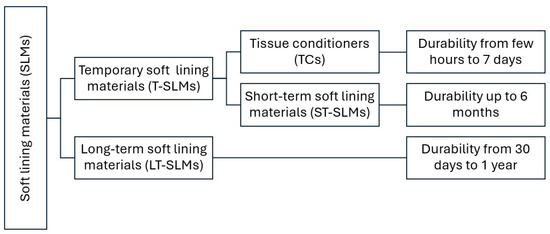 According to the use time, temporary soft lining materials (T-SLMs) and long-term soft lining materials (LT-SLMs) can be distinguished. T-SLMs include tissue conditioners (TCs) and short-term soft lining materials (ST-SLMs) (Figure 1) [49,50,51,52,53].