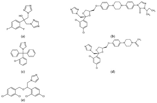 Chemical structure of azole drugs: (a) fluconazole; (b) itraconazole; (c) clotrimazole; (d) ketoconazole; and (e) miconazole. Based on [106].