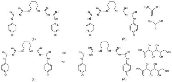 Chemical structure of (a) chlorhexidine (based on [119]); (b) chlorhexidine diacetate (based on [64]), (c) chlorhexidine dihydrochloride (based on [64]); and (d) chlorhexidine digluconate (based on [77]).