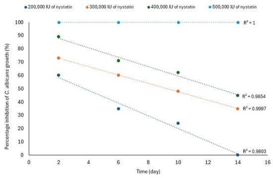 Sunsil et al. confirmed that the antifungal effect of the nystatin-loaded SLM depends on the drug concentration and time. They loaded Visco-GEL with different amounts of nystatin (200,000, 300,000, 400,000, and 500,000 IU) and determined the percentage inhibition of C. albicans growth after 2, 6, 10, and 14 days. A total inhibition of C. albicans growth was observed for 14 days with 500,000 IU of nystatin. Lower doses of nystatin did not result in a complete inhibition of fungal growth. For example, only 24% inhibition of C. albicans growth was observed for the material with 200,000 IU of nystatin after 10 days. This allowed us to conclude that the minimum effective concentration of nystatin in the SLM is 500,000 IU, which is only 31% of the daily dose of this medicine (taking 1,600,000 IU as its value, Table 7) [81]. Interestingly, a mathematical analysis of the percentage inhibition of C. albicans growth and time revealed a linear relationship between these parameters (Figure 5). It can be seen that the longer the SLM’s service time, the lower the percentage inhibition of C. albicans growth, except for the material loaded with 500,000 IU of nystatin, for which no time effect was observed for 14 days [70].