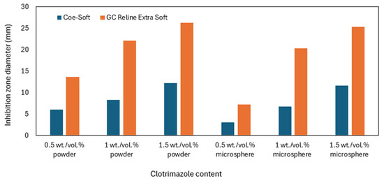 Chopde et al. confirmed the antifungal effect against C. albicans of the nystatin-loaded Visco-GEL TC (Table 1) in the disk diffusion agar test. The IZD they determined was 10.42 mm. They also investigated the nystatin-loaded GC Soft Line TC (Table 1). They observed the presence of a growth inhibition zone around the samples, with an IZD of 10.5 mm, which was similar to that found for Visco-GEL [39].