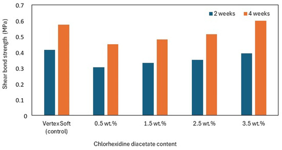 - Albrecht, N.; Fidalgo, T.K.D.S.; DEAlencar, M.J.S.; Cople, L.; Urban, V.M.; Neppelenbroek, K.H.; Reis, K.R. Peel bond strength and antifungal activity of two soft denture lining materials incorporated with 1% chlorhexidine diacetate. Dent. Mater. J. 2018, 37, 725–733. [Google Scholar] [CrossRef] [PubMed]