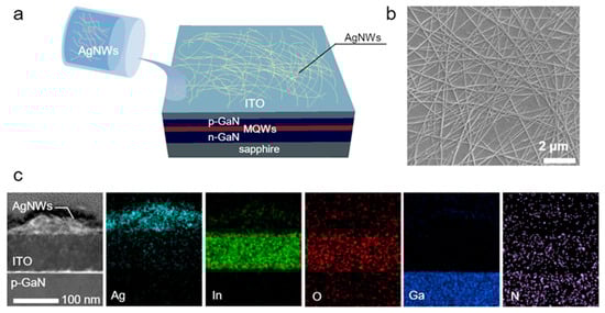 - Jeong, G.-J.; Lee, J.-H.; Han, S.-H.; Jin, W.-Y.; Kang, J.-W.; Lee, S.-N. Silver Nanowires for Transparent Conductive Electrode to GaN-Based Light-Emitting Diodes. Appl. Phys. Lett. 2015, 106, 031118. [Google Scholar] [CrossRef]