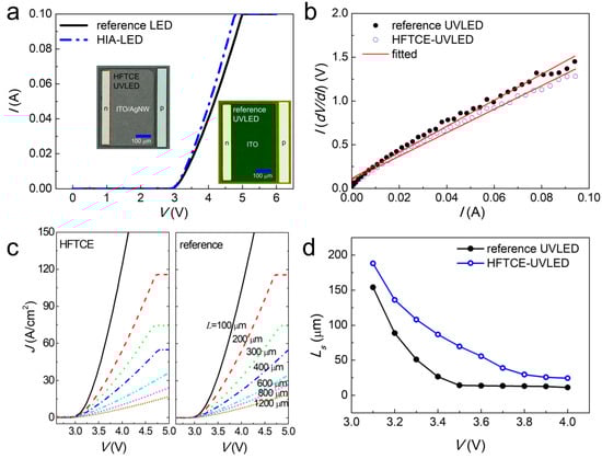 - Kim, H.; Lee, S.-N. Theoretical Considerations on Current Spreading in GaN-Based Light Emitting Diodes Fabricated with Top-Emission Geometry. J. Electrochem. Soc. 2010, 157, H562–H564. [Google Scholar] [CrossRef]
