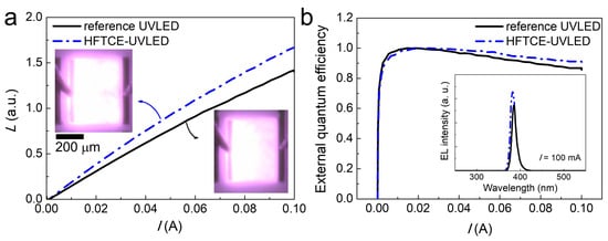 - Fan, X.; Xu, S.; Huang, Y.; Liu, W.; Tao, H.; Zhang, J.; Hao, Y. Improved Efficiency Droop of 370 nm UV LEDs with ITO/Au/ITO Structure. ECS J. Solid State Sci. Technol. 2023, 12, 096001. [Google Scholar] [CrossRef]