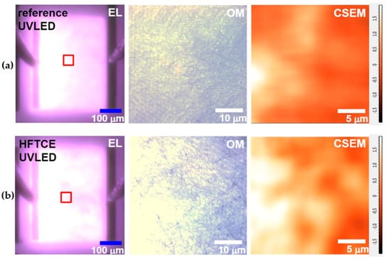 - Hrong, R.-H.; Zeng, Y.-Y.; Wang, W.-K.; Tsai, C.-L.; Fu, Y.-K.; Kuo, W.-H. Transparent Electrode Design for AlGaN Deep-Ultraviolet Light-Emitting Diodes. Opt. Exp. 2017, 25, 32206–32213. [Google Scholar] [CrossRef]