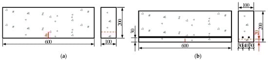 Single-edge notched beam (SENB) specimens with dimensions of 100 mm × 200 mm × 600 mm, as shown in Figure 1, were adopted for fracture test. This test was chosen to evaluate the concrete’s resistance to crack propagation, a critical factor in bridge engineering [31]. The height of the specimen, 200 mm, represents a typical lower bound value in bridge deck applications. Through-thickness straight notches of various depths were prefabricated at the midspan section of the bottom surface of SENB specimens. Altogether, 34 specimens were prepared in two series, namely, 28 for the PC series and 6 for the RC series. All PC specimens were made from plain concrete, while the RC series consisted of reinforced concrete beams. Nine companion 150 mm × 150 mm × 150 mm concrete cubes were obtained for the concrete batch to verify its grade through a compressive strength test.